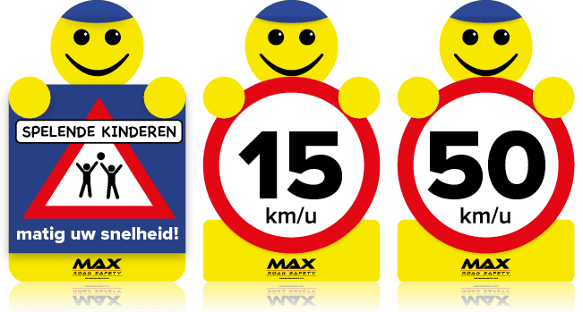 Hét veiligheidspoppetje dat voorbijkomend verkeer attendeert op de verkeerssituatie. Ter bescherming van spelende kinderen in gebieden waar vaak hard wordt gereden. Max laat zien hoe hard je maximaal mag rijden of dat er spelende kinderen in de buurt zijn. Goed zichtbaar dankzij de opvallende kleuren. Gemaakt van lichtgewicht, weer-, wind- en temperatuurbestendig platen.